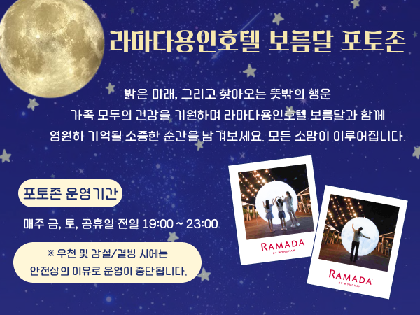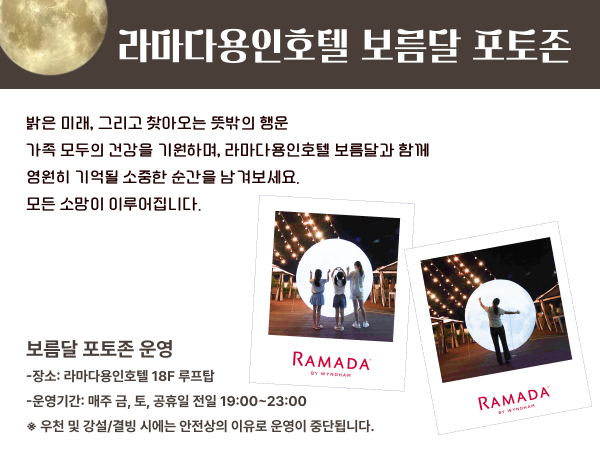 Ramada Yongin Hotel 2025 Chuseok Special Events 가을밤 가장 환한 달빛이 머무는 곳, 라마다용인호텔 입니다.🌕한가위의 풍요로움 속에서 사랑하는 사람과 함께 머무는 시간, 달빛 아래에서 나누는 대화와 웃음은 오래도록 빛나는 추억이 됩니다.라마다용인호텔이 준비한 특별한 추석 이벤트로 그 순간을 완성해 보세요.[라마다용인호텔 2025 추석 특별 이벤트]✅전통 퓨전 국악 연주전통과 현대의 만남, 장르를 넘나드는 앙상블!🎶* 공연명 : 추석맞이 퓨전 국악 앙상블최신 K-pop ,90&00년대 히트곡 메들리 등* 운영일시: 2025년 10월 05일(일) 20:00-21:00* 장 소: 1F 호텔로비✅추석 특선 조식 및 석식 뷔페호텔에서 즐기는 풍성한 추석 특선 메뉴!🍖* 조식 특선 메뉴: 송편, 모듬떡, 녹두전, 삼색나물, 명태무침 등 120여 가지의 메뉴* 석식 특선 메뉴: 가을 대하구이, 단호박 식혜, 전복 갈비찜, 영양 도가니탕, 모듬떡, 녹두전, 삼색나물, 송편 등 150여 가지의 메뉴* 운영일시 : 10월2일(목)~10월8일(수)* 장 소 : 2F 로즈마리 레스토랑✅루프탑 전통 놀이온가족이 함께하는 전통놀이 체험!⭐* 내 용 : 윷놀이, 투호, 사방치기, 딱지치기, 제기차기* 운영일시 : 10월3일(금)~10월9일(목)* 장 소 : 18F 루프탑✅보름달 포토존대형 보름달 포토존에서 소중한 순간을 담아보세요!🌕* 운영일시 : 10월3일(금) ~10월9일(목) 19:00-23:00* 장 소 : 18F 루프탑 고객님의 소중한 시간을 더욱 특별하게 만들어드리기 위해 최선을 다하겠습니다.𝐑𝐀𝐌𝐀𝐃𝐀 𝐘𝐎𝐍𝐆𝐈𝐍 𝐇𝐎𝐓𝐄𝐋문 의: 📞031-8097-6500