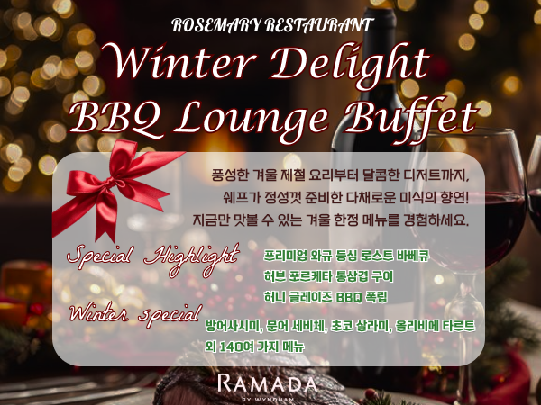 🐎🔥2026 붉은말의 해, 라마다용인호텔에서 새해 福을 든든하게 채우세요!힘차게 달리는 붉은말의 기운처럼,2026년이 더욱 활기차고 풍요로운 한 해가 되시길 바랍니다.라마다용인호텔은 새해를 맞아 1월 한 달 동안 특별 조식 이벤트를 준비했습니다.든든한 국물 한 그릇이 전해주는 위로, 아침을 여는 따뜻한 온기 :)투숙객 여러분을 위해 ‘조식 라이브 쌀국수’를 무료 제공해드립니다.따뜻한 아침식사에서 작은 행복과 여유를 느껴보세요.🍜[2026년 1월 주중 조식 라이브 쌀국수 이벤트]기간 │ 01/02 ~ 01/30 (주중 진행)시간 │ 07:00 ~ 10:00장소 │ 2F 로즈마리 레스토랑※ 주중 호텔 투숙 시 제공되는 투숙객 무료 서비스입니다.※ 본 이벤트는 주중(평일) 조식 한정으로 진행됩니다.※ 주말(토,일) / 공휴일 및 연휴는 조식 뷔페로 운영됩니다. 🎁RAMADA HOTEL PACKAGE✅2026년을 더욱 특별하게 만들어줄 다양한 패키지 또한 준비되어 있습니다.조식 뷔페 PKG딜라이트 바비큐 라운지 석식 뷔페 PKG해피아워 라운지 PKG로맨틱 PKG피크닉 박스 PKG로맨틱 프러포즈 PKG가족, 연인, 친구, 누구와 함께여도 완벽한 여행이 되도록 다양한 테마의 패키지를 선보입니다.🍴MEETING & BANQUET✅비즈니스와 연회 행사를 위한 최적의 시설도 준비되어 있습니다.최대 300명 수용 가능한 넓은 연회장행사 품격을 높여주는 연회 지원(뷔페,코스 요리)매주 토요일 및 공휴일 전일 운영되는 140여 가지 메뉴의 상설 뷔페기업 행사부터 가족 연회까지, 격조 높은 공간과 서비스로 완성도 있는 이벤트를 제공드립니다.라마다용인호텔은 여행의 기쁨, 쉼의 여유, 특별한 순간까지올해도 변함없이 고객 여러분들과 함께 달리겠습니다. 🐎✨HAPPY NEW YEAR 2026!