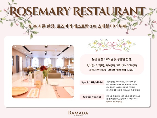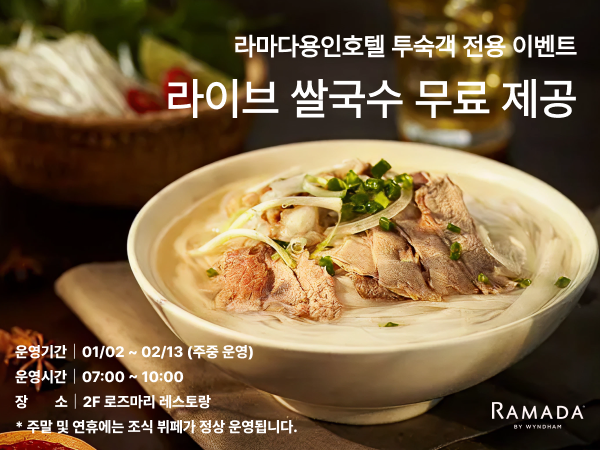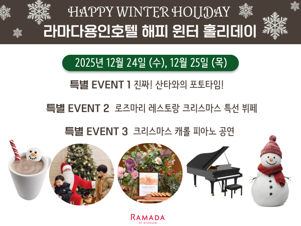 Ramada Yongin Hotel 2025 Chuseok Special Events 가을밤 가장 환한 달빛이 머무는 곳, 라마다용인호텔 입니다.🌕한가위의 풍요로움 속에서 사랑하는 사람과 함께 머무는 시간, 달빛 아래에서 나누는 대화와 웃음은 오래도록 빛나는 추억이 됩니다.라마다용인호텔이 준비한 특별한 추석 이벤트로 그 순간을 완성해 보세요.[라마다용인호텔 2025 추석 특별 이벤트]✅전통 퓨전 국악 연주전통과 현대의 만남, 장르를 넘나드는 앙상블!🎶* 공연명 : 추석맞이 퓨전 국악 앙상블최신 K-pop ,90&00년대 히트곡 메들리 등* 운영일시: 2025년 10월 05일(일) 20:00-21:00* 장 소: 1F 호텔로비✅추석 특선 조식 및 석식 뷔페호텔에서 즐기는 풍성한 추석 특선 메뉴!🍖* 조식 특선 메뉴: 송편, 모듬떡, 녹두전, 삼색나물, 명태무침 등 120여 가지의 메뉴* 석식 특선 메뉴: 가을 대하구이, 단호박 식혜, 전복 갈비찜, 영양 도가니탕, 모듬떡, 녹두전, 삼색나물, 송편 등 150여 가지의 메뉴* 운영일시 : 10월2일(목)~10월8일(수)* 장 소 : 2F 로즈마리 레스토랑✅루프탑 전통 놀이온가족이 함께하는 전통놀이 체험!⭐* 내 용 : 윷놀이, 투호, 사방치기, 딱지치기, 제기차기* 운영일시 : 10월3일(금)~10월9일(목)* 장 소 : 18F 루프탑✅보름달 포토존대형 보름달 포토존에서 소중한 순간을 담아보세요!🌕* 운영일시 : 10월3일(금) ~10월9일(목) 19:00-23:00* 장 소 : 18F 루프탑 고객님의 소중한 시간을 더욱 특별하게 만들어드리기 위해 최선을 다하겠습니다.𝐑𝐀𝐌𝐀𝐃𝐀 𝐘𝐎𝐍𝐆𝐈𝐍 𝐇𝐎𝐓𝐄𝐋문 의: 📞031-8097-6500